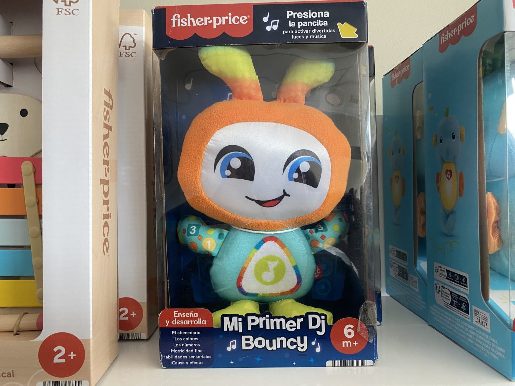 UN ADORABLE COMPAÑERO. Juguete portátil de peluche para bebé con luces, música y sonidos del DJ Bouncin’ Beats para jugar educativamente durante los viajes de los bebés de 6 meses en adelante.